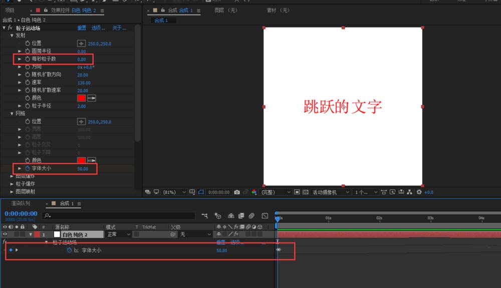 4、将每秒粒子数调整为0;点击网格下的文字大小前的小秒表,打下关键帧,设置文字大小为50;pagedown到下一帧,将文字的的大小设置为0;如果字体大小不设置为0的话,文字就不会一直被复制;