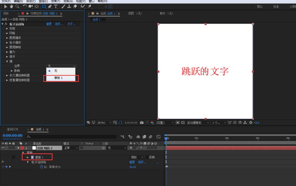5、为了将文字的运动范围限制在画布内,选中纯色层,用矩形工具绘制一个蒙版;然后点击粒子运动场的墙的边界选择为刚刚画的蒙版1;按下空格键就可以预览到文字已经实现在画布里面跳跃了;