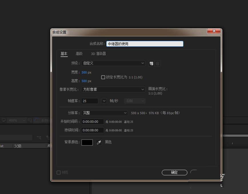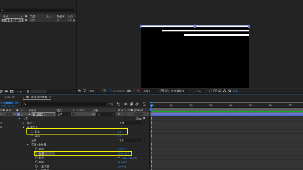 1、打开AE软件,命名中继器的使用,调整相应的参数。