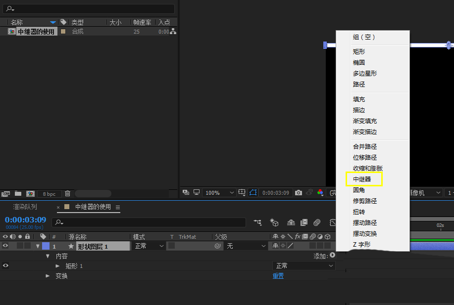 3、点击形状图层旁边的添加,为形状图层添加中继器效果;