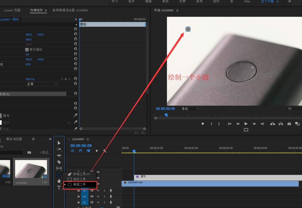 2、选择钢笔工具组中的椭圆工具,然后在节目窗口左上角绘制一个合适的正圆小圆点出来。