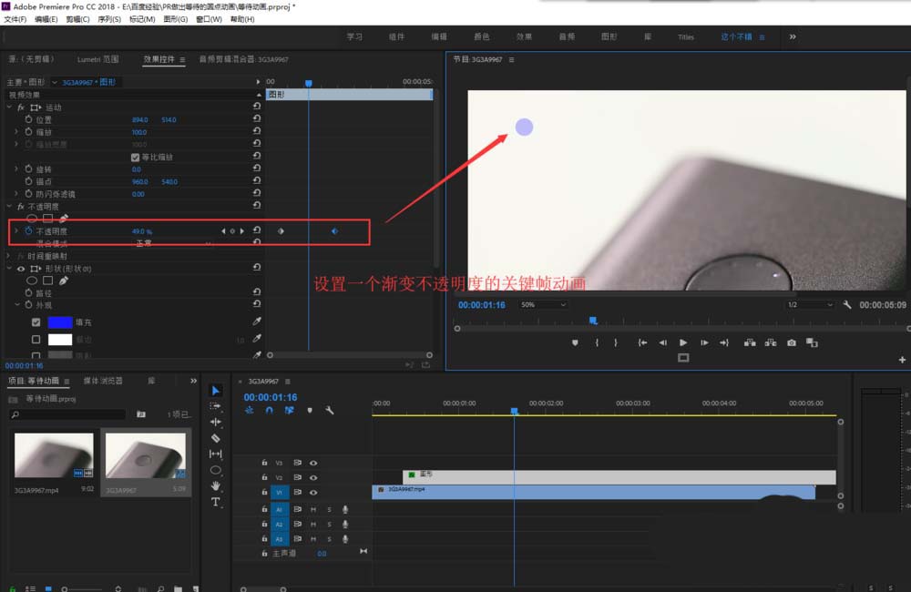 4、打开效果控件窗口,在效果控件中找到不透明度的设置,为当前这个小圆点设置一个不透光明度的关键帧动画。