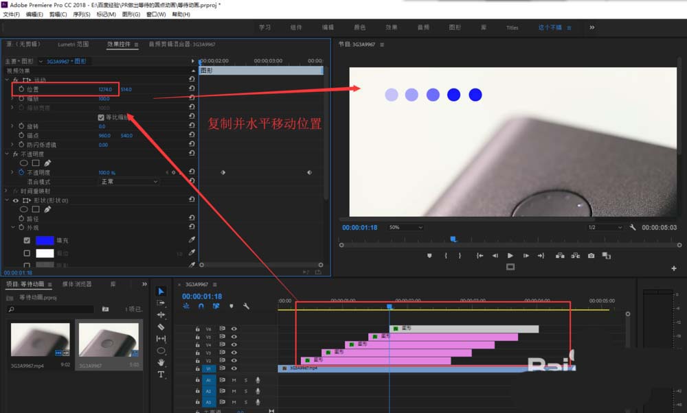 5、将这个小圆点进行复制,总共得到五个并间隔相同时间,然后依次选中复制的圆点,在效果控件中调整其水平位置。