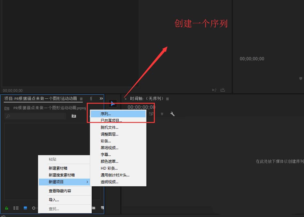 2、在新建的项目窗口右键鼠标,在弹出的右键数遍选项中执行新建中的序列命令,来创建一个序列。