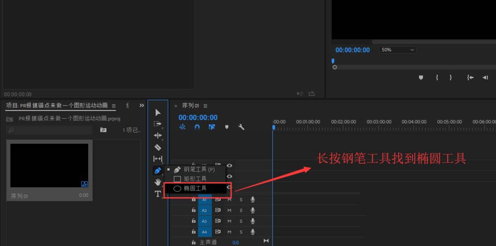 3、找到PR工具栏中的钢笔工具,鼠标左键长按这个钢笔工具,打开工具组找到椭圆工具。