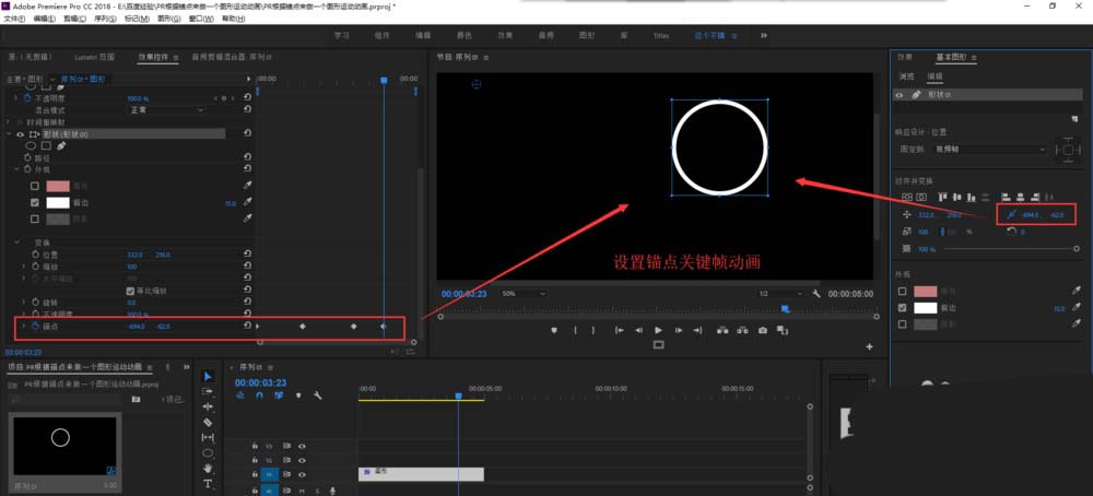 5、在效果控件或者是基本图形窗口中找到锚点设置,为锚点设置关键帧,然后移动时间轴在设置锚点位置,做出一个锚点位置移动的关键帧动画。