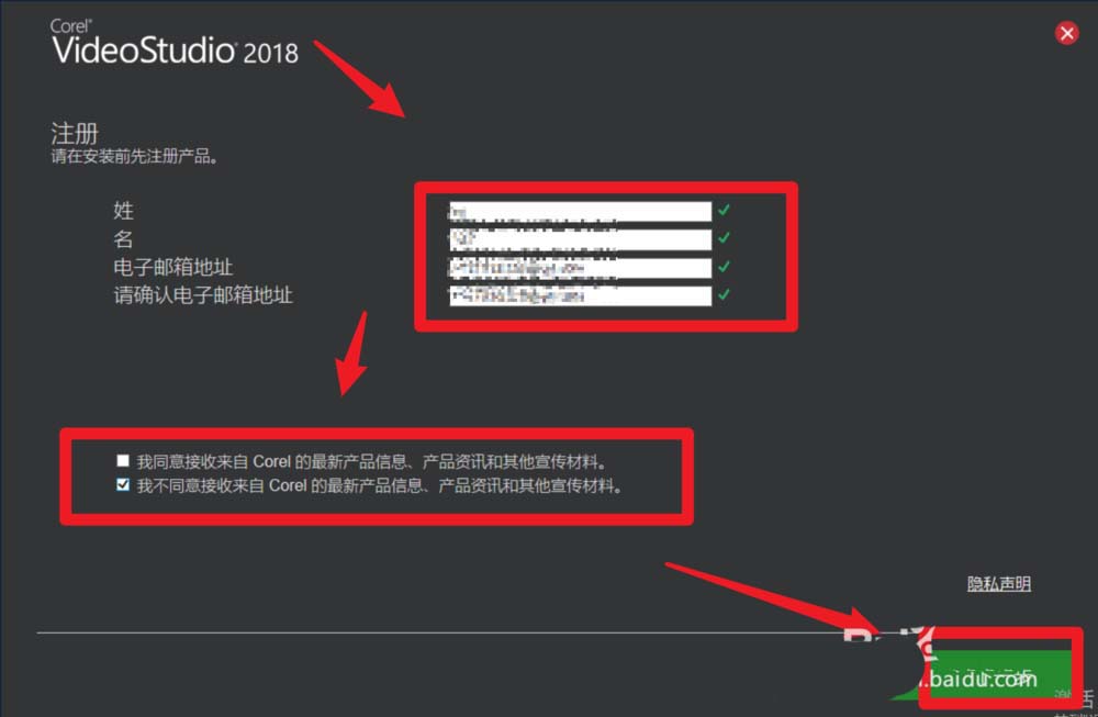 5、点击下一步之后,输入你的姓名、电子邮箱,点击同意或者不同意接收信息,之后点击下一步,如图所示。不填写信息是安装不了的。