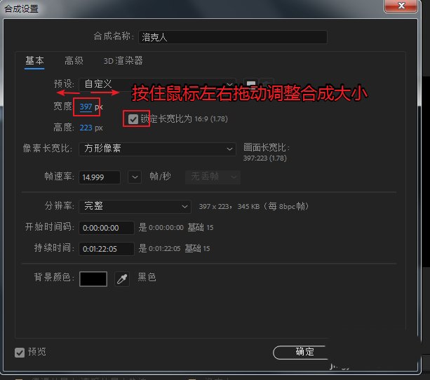 3、然后把鼠标放到宽度数值上,按住鼠标左右拖动调整合成大小。