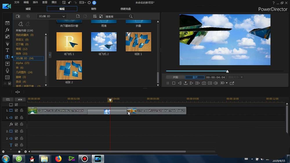 1、首先就是 纸飞机效果的位置,是在威力导演效果里面的-3D类/3D- 里面,里面有1和2两个效果