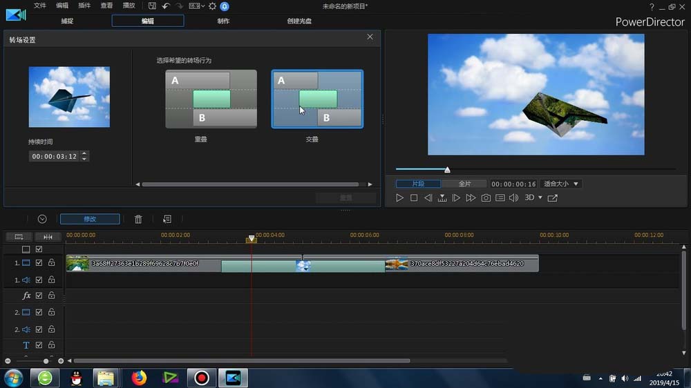 3、可以将纸飞机1或2效果拖放到两端素材的中间,形成默认的纸飞机1或2效果