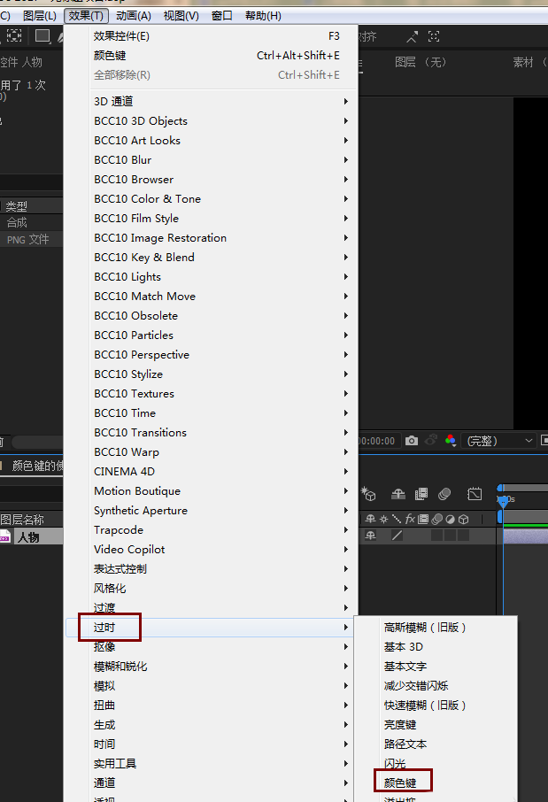 3、选中人物图层,添加颜色键效果,效果-过时-颜色键。