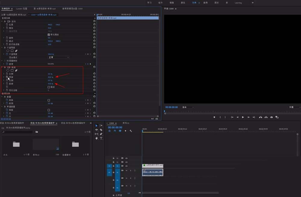 4、然后在“效果控件”栏里,就有了裁剪的选项,顶部修改为50%,底部修改为50%(如下图)