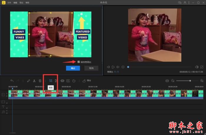 因为比例不同出现了黑边,所以需要把画面裁剪一下。选中素材,点击工具栏的“裁剪”按钮,勾选保持宽高比,然后调整裁剪框的大小和位置,按确定就可以了。