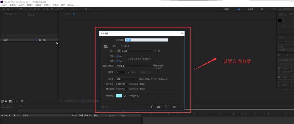 1、打开并进入到AE编辑界面中,按Ctrl+N执行新建合成命令,弹出合成设置对话框,在该对话框中设置AE合成属性。