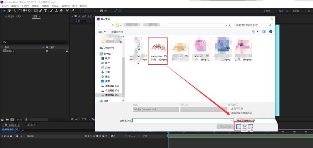 2、执行文件菜单栏中的导入命令,打开并弹出“导入文件”对话框,在该对话框中找到素材文件并选中导入到AE项目管理窗口中。
