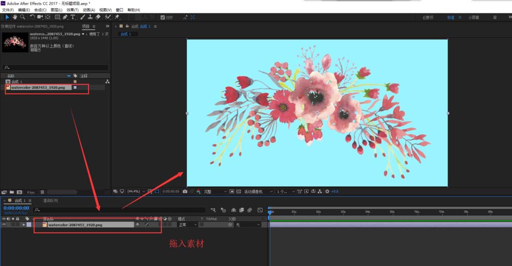 3、在项目窗口中选中导入的图片素材文件,按住鼠标左键不松将其拖入到图层窗口,这时候素材就会在舞台中进行显示了。