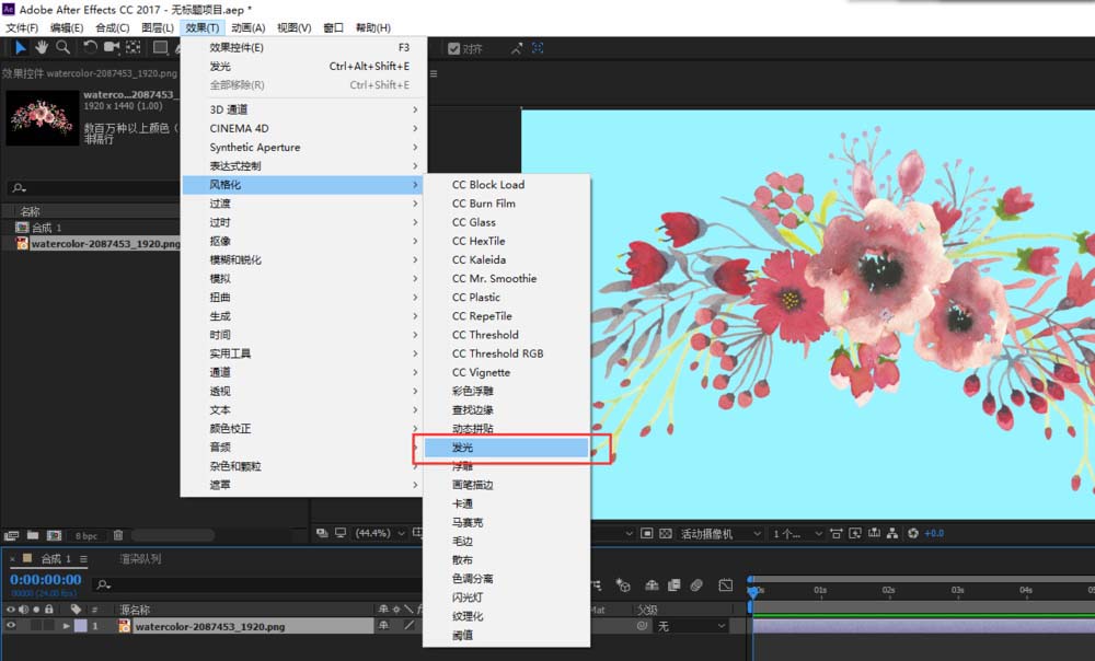4、选中图片素材,执行效果菜单栏中的风格化,找到发光命令,为图片素材添加一个发光的效果。