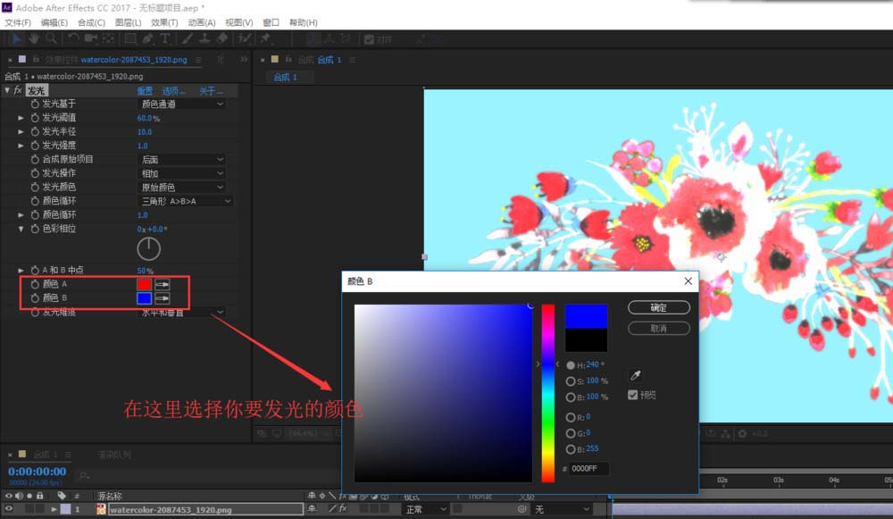 6、将发光颜色选为“A与B颜色”,调整发光半径,还可以设置一些其他的必要参数,得到最终的一个不同颜色的发光效果。