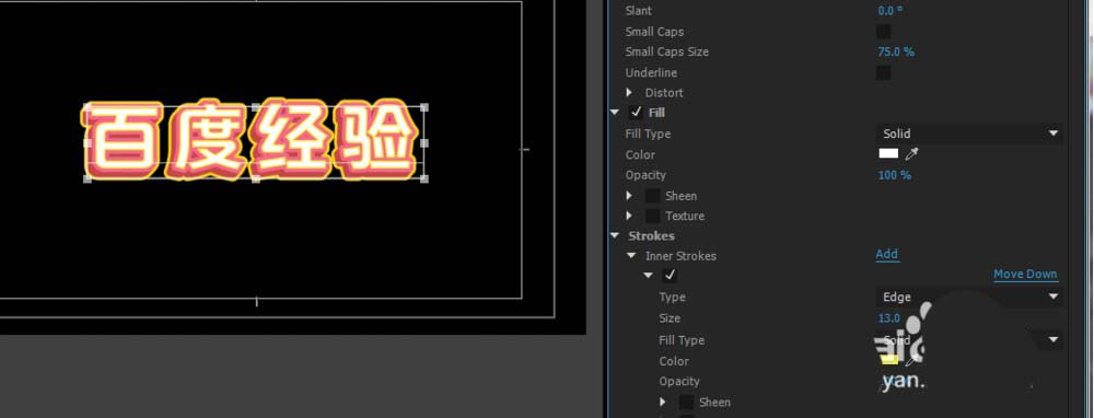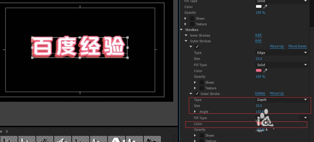 然后我们给文字添加第二层的深色,使它有3d感,再次按下Outside(外层)add,再给他添加一层描边,然后更改Type(类型),改成第一个,这样就会有3d感觉出来了,再更改一下他的颜色大小和旋转