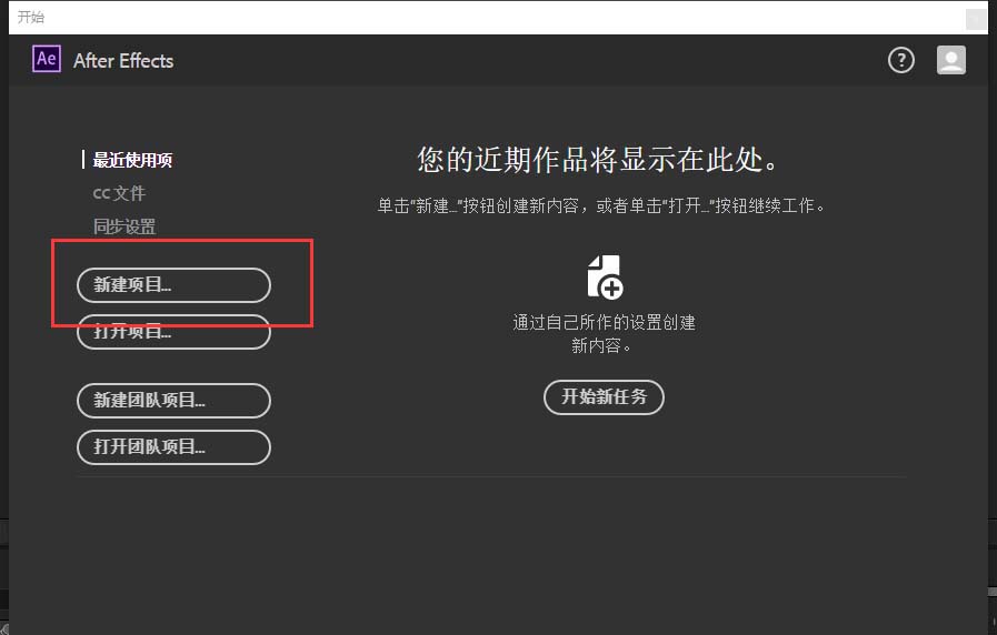1、在打开启动的After Effects软件中执行开始页,在开始页中执行“新建项目”这个命令来创建一个AE项目。
