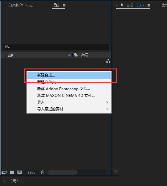 2、在After Effects新建的项目窗口处,右键鼠标,在出现的右键鼠标选项中执行“新建合成”。