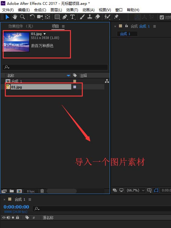 3、执行文件导入文件命令,选择一个图片素材导入到After Effects项目中,等待编辑操作。