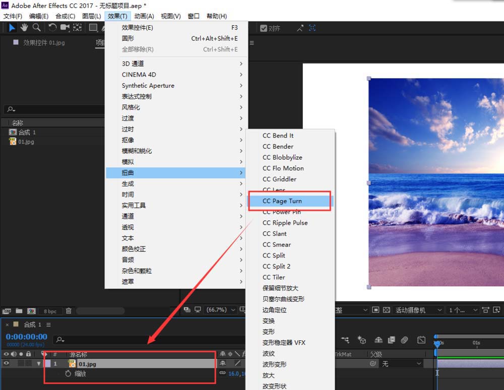 5、选中合成1中的图片图层,点开效果菜单栏,找到扭曲中的CC Page Turn这个效果,并单击添加效果。