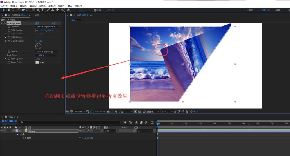 6、添加了CC Page Turn效果之后,我们可以拖动翻页的锚点来拖动折页效果,或者在效果控件中设置参数来达到折页效果。