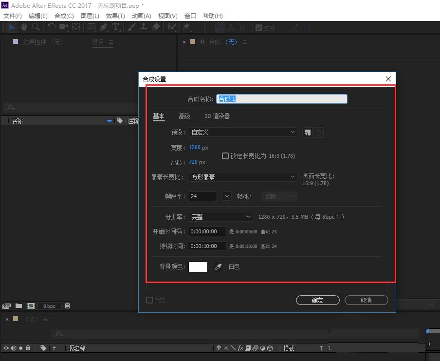 1、启动并进入到After Effects软件之后,按Ctrl+N执行新建合成命令,然后弹出合成设置对话窗口,设置合成。