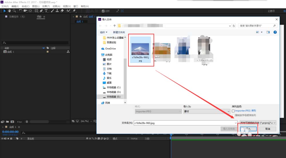 2、在新建的合成1处双击鼠标的左键,进行文件导入的快捷操作,打开导入文件窗口,选择一个图片进行导入。