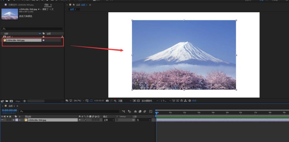 3、鼠标单击导入的图片素材,然后拖动鼠标将导入的图片素材拖入到合成1预览画面中并生成图片素材图层。