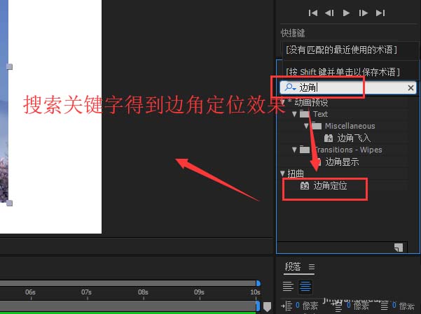 4、打开显示效果与预设,在效果与预设搜索框中搜索关键字“边角定位”,然后进行搜索得到边角定位AE内置效果。