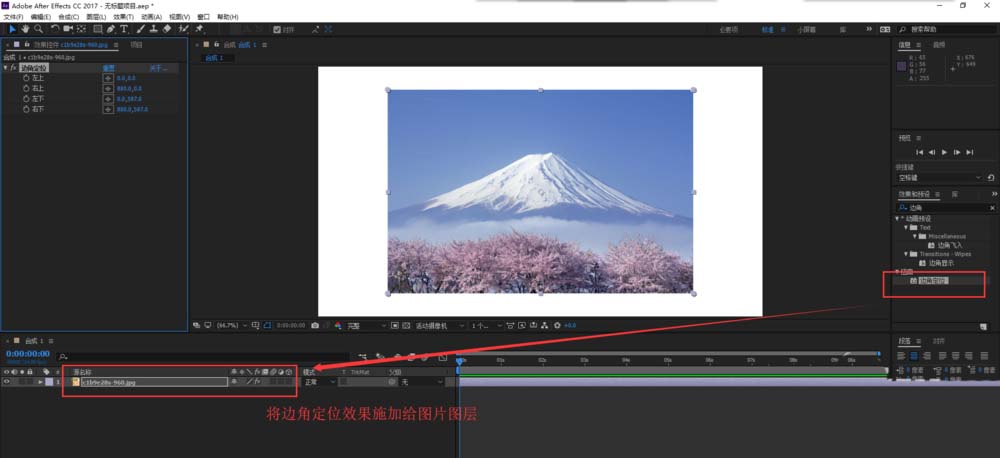 5、鼠标单击选中搜索得到边角定位的AE内置效果,然后将其拖动添加到图片素材图层上。