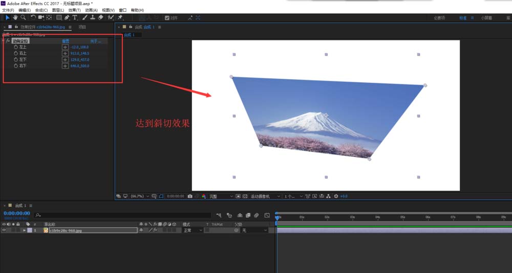 6、切换到效果控件窗口,设置四个边角的数值或者直接拖动图片的四个边角的锚点来设置斜切效果,调整一个你满意的斜切图片。