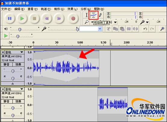 ”音频大小工具,按住该移动到音轨上面,随便在音频区内点击,这时我们可以看到音轨中出现白色区域,这时单击音轨上下拖动鼠标,就会出现弯曲现象;你可以利用该方法做出N个点来调控音频声音的大小。如图8所示。