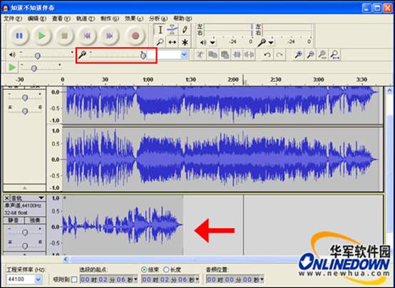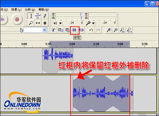 声音大小调整完成以后;单击选择工具,如果还是调整大小状态,很容易再次调整声音。如果我们要删除音频中的一部分声音的话,只需选中音频中要删除声音部分,然后按钮键盘上的“Delete”按钮即可;你也可以选择要保留的音频内容,然后单击工具样上的“修剪”按钮将选中的音频文件保留,删除没有选取的音频文件。如图9所示。