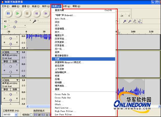 然后在“效果”菜单下为音频文件添加效果;效果非常的多用户可以自己动手试一下,每种效果都会给你来不同效果的听觉效果。选中要添加效果的音频部分,然后再进行效果添加。如图11所示。