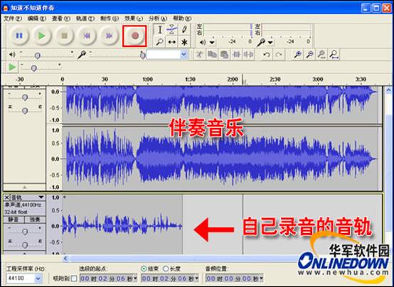 ”录音按钮,就可以开始录歌了;现在只要你开唱就可以了。这时我们可以看到界面上多出一音轨,就是我们自己唱歌的录音。如图5所示。