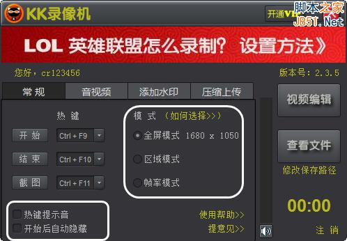 英雄联盟以窗口模式运行,KK选择全屏模式/区域模式录制。