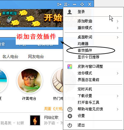 打开酷狗,点击软件又上角的第二个图标“主菜单”,选择“音效插件”: