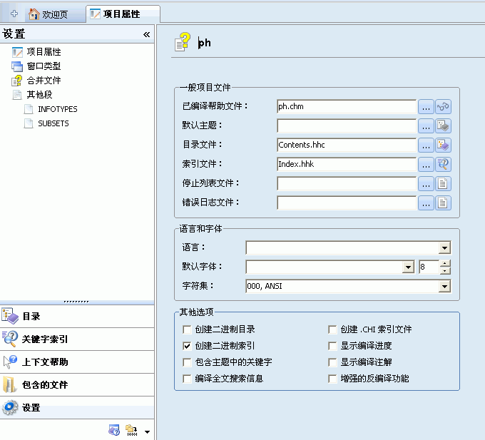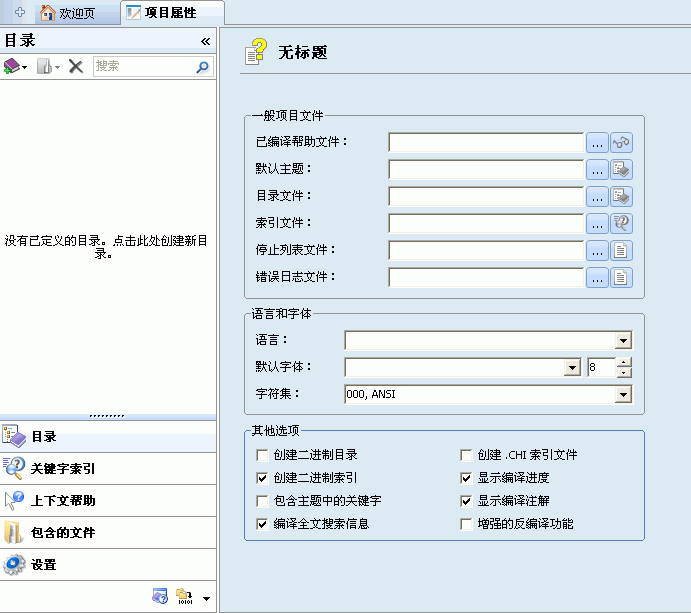 现在回到原来的项目属性选项卡,可以看到“目录文件”和“索引文件”输入框已经自动填好了(自动生成的目录文件和索引文件与项目文件在相同目录),这里补充一些必要的部分: