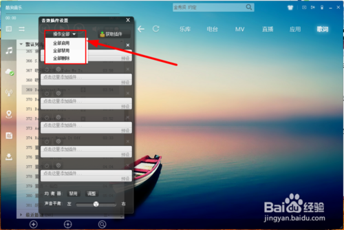 打开酷狗音乐软件,点击“主菜单”-“音效插件”,弹出音效插件框。