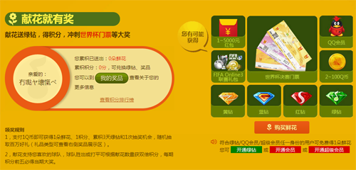 3,购买鲜花支付成功后您有可能随机获得世界杯决赛门票、巴西15天品质游、1~5000元红包、FIFAonline3礼包、2~100Q币、1~12个月QQ会员、黄钻、绿钻、红钻、蓝钻等奖品。