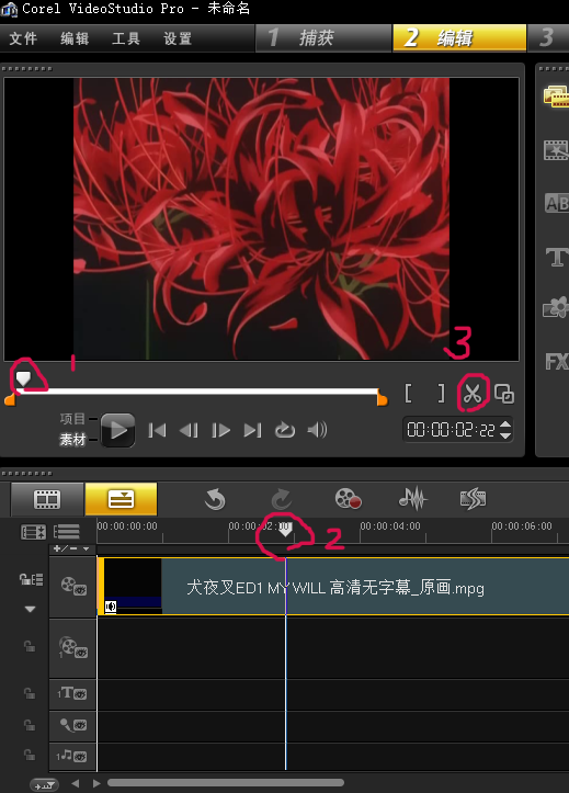 图中1和2就是拖视频用的,比如你要这个素材的第三分钟到第五分钟的视频,就可以用这两个拖(1拖的比较快,而2是比较细致的)。