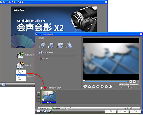 如果要将创建的视频刻成光盘,在会声会影是十分方便的,你只要在“分享”菜单中点击“创建光盘”,即可按照引导,一步步操作下去,即可顺利完成。