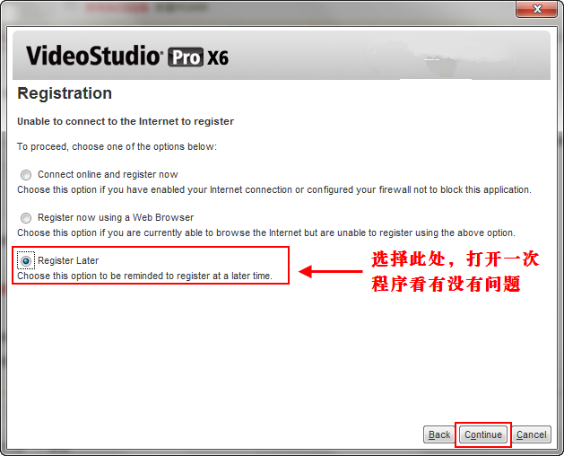 5、完成安装后,我们点击桌面的程序快捷键打开程序会出现一个让你选择注册的界面,我们先选Register Later打开一次程序看有无问题,没问题就关闭程序。