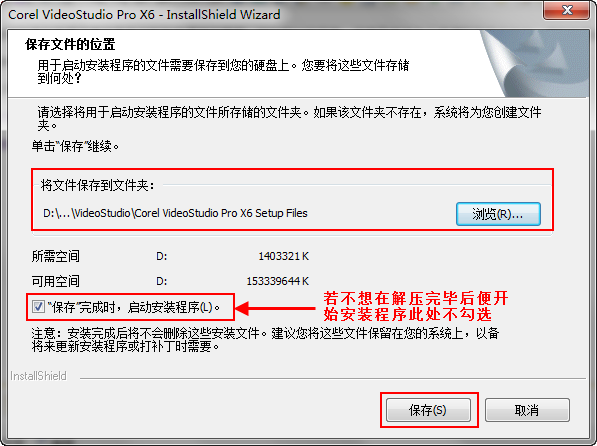 1、下载会声会影x6原版程序并解压到指定位置,解压时会默认勾选保存完毕后启动安装程序,若不想在解压完毕后便开始安装的朋友将其勾掉就可以了。