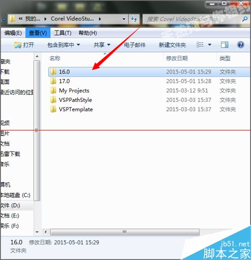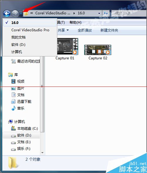 3、这时候在它弹出的面板中我们看到它的位置。如果是想更详细的知道它的确切位置,我们可以看到在Corel VideoStudio Pro前面有一个下拉的小三角,我们可以用鼠标点击一下,这时就可以在下拉列表中看到它的准确位置,它是在计箕机---d盘---我的文档----Corel VideoStudio Pro----16.0中。