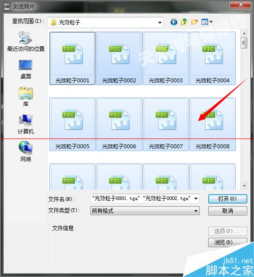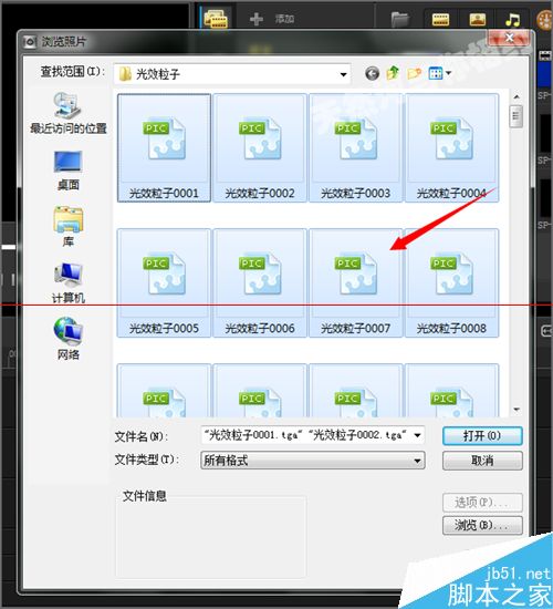 2、插入照片之后,我们可以选择我们想要导入的一些图片素材,这里就选择一个tga序列的光效素材。点击第一张序列然后按着键盘上的ctr+a键选择全部,然后点击打开。当然也可以导入其它格式的图片序列。