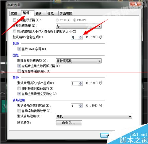 5、我们在参数面板中点击编辑,找到默认照片/色彩区间。可以看到一般会声会影的软件在没有更改它的设置之前,它的照片区间默认的是3秒。我们进行一下更改最小也只能调到1。这样箕下来它的播放时间还是很长。这样还是不行。